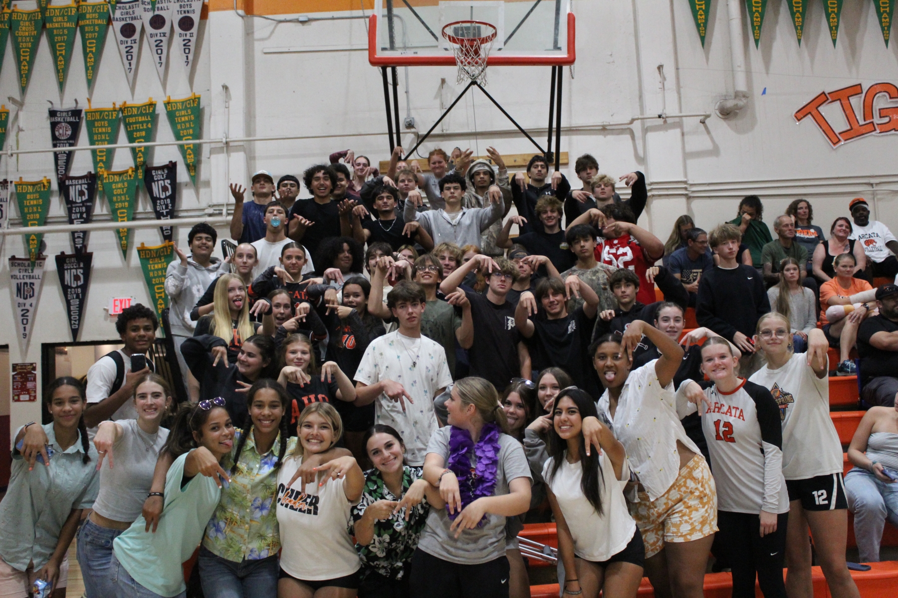 The student section, mostly clad in the theme of tropical wear, came ready with witty cheers and yelled as loudly as they could.